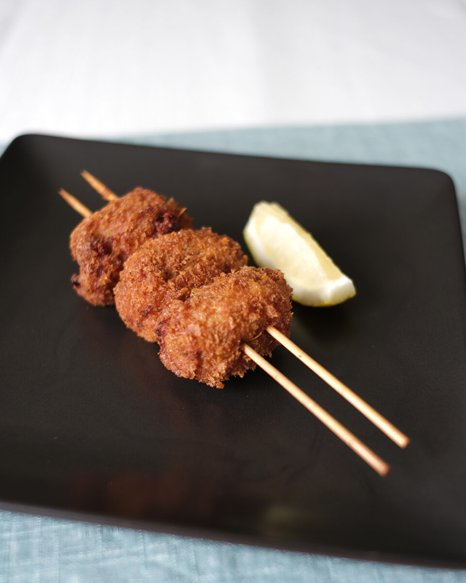 「たまごにかけるお醤油」をはじめ、ポン酢・おろし生姜・レモン汁で味付けした大根おろしの餡を大葉で包み、豚バラスライスで巻いてカラッと揚げた一品です。