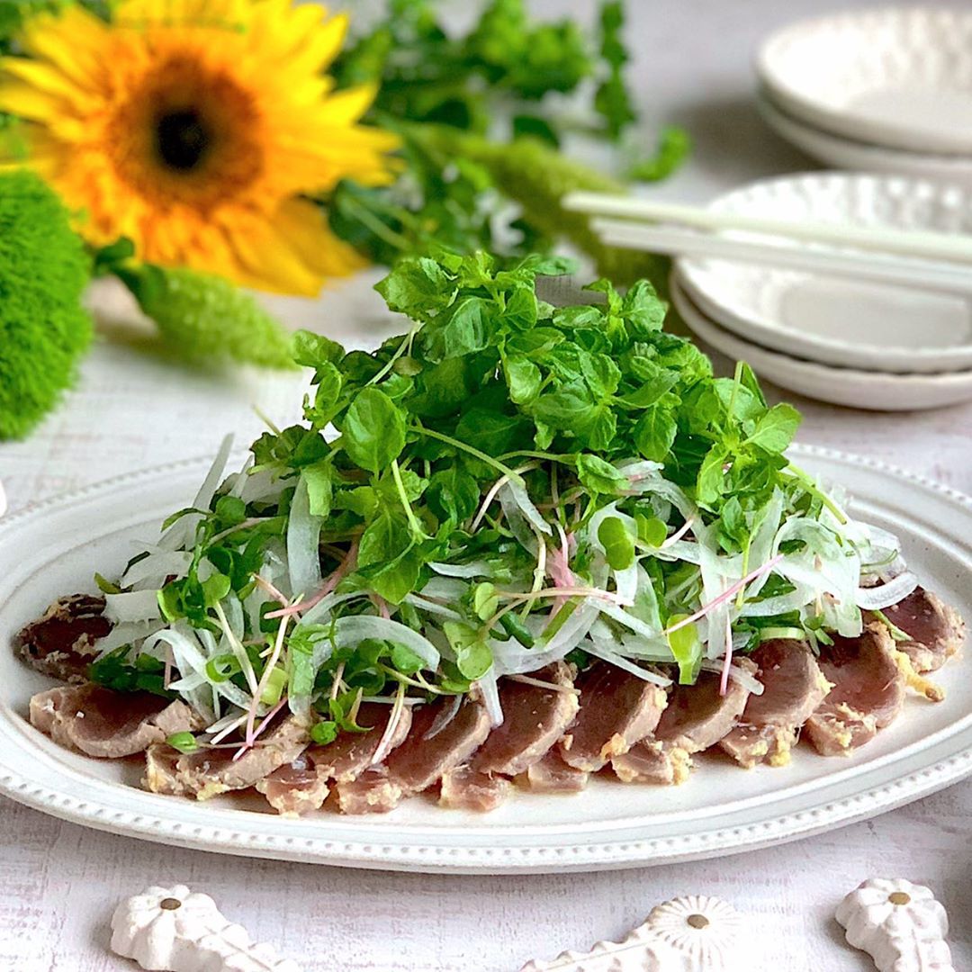 3.新玉ねぎはスライサーで薄切り、茗荷は薄切り、細ねぎは小口切り、貝割れ大根は2〜3等分の長さにして、ペリーラと共に全てを混ぜ合わせておく。にんにくは薄切りにしておく。
