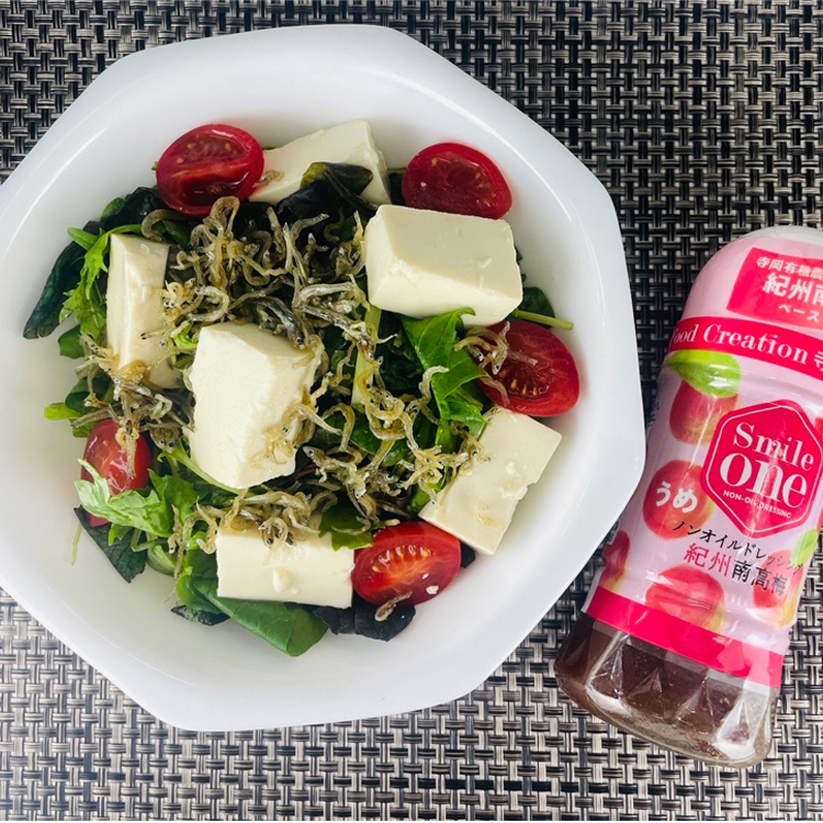 3.ベビーリーフと切った豆腐、ミニトマトを盛り付ける。